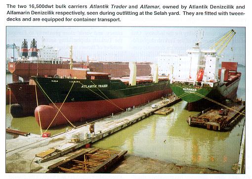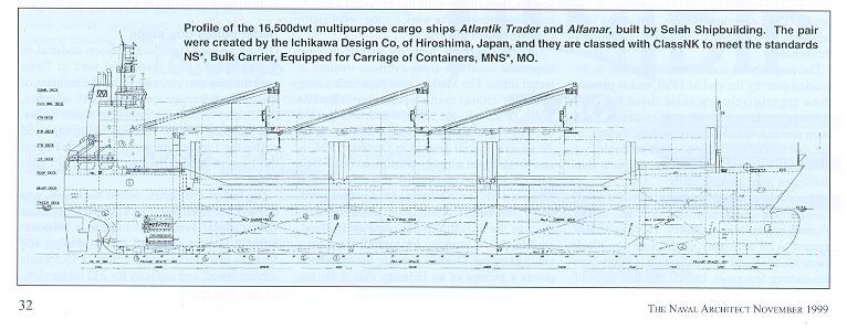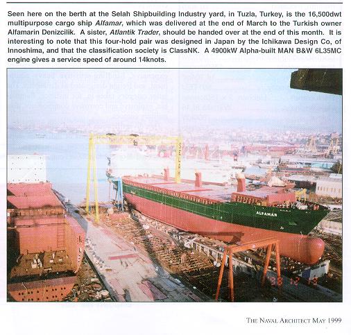 イギリスの雑誌、.The Naval Architect の5月号、1999と11月号、 1999に弊社が設計した多目的バルクキャリア. "M/V ALFAMAR". と ."M/V ATLANTIK TRADER". が紹介されました。船主の好意で、 弊社の社名、.ICHIKAWA DESIGN CO., LTD.. と所在地、.HIROSHIMA. が設計者として5月号と11月号の両方に紹介されました。.大変に光栄に思っております。 .弊社が設計した."M/V ALFAMAR" . と."M/V ATLANTIK TRADER". は、.トルコの民営の造船所で建造された造船歴史上最大級の船舶になります。 . この2隻のバルクキャリアの船番(Hull Number)は、.No. 027とNo. 028です。 . 船番No.009で100m以上のバージを建造していた造船所にしては、.飛躍的な進歩です。 . 進水式には、.トルコの首相を招待する予定だったようですが、. 引渡しの予定が延びて来られなかったのが残念です。.この2隻の引渡しが無事終わり、. 10隻のバルクキャリアの発注商談が造船所に来ているそうです。.弊社は、.トルコでの経験と国際的な経験を生かして、 .これからも良い船舶の設計をし ていきたいと思っています。.海外で船舶の建造を考えている船主、 .また、. 日本での建造を考えている船主からの連絡をお待ちしております。